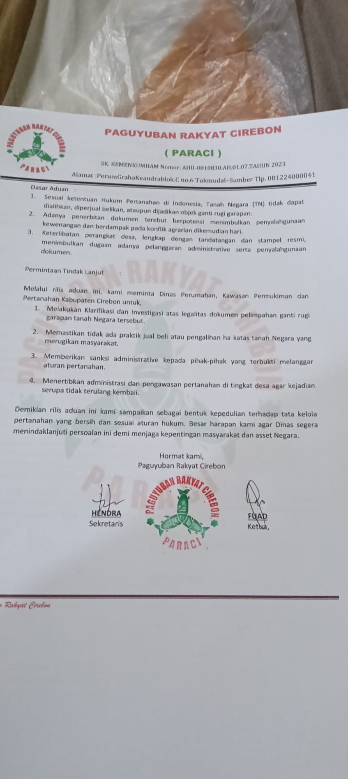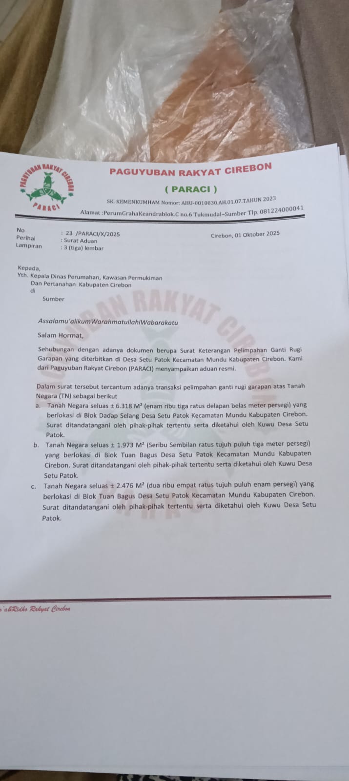 Pada Selasa (22/10/2025), Paguyuban Rakyat Cirebon (PARACI) mendatangi kantor Desa Setu Patok untuk melakukan klarifikasi atas dugaan jual beli tanah negara (TN) yang melibatkan warga Kota Cirebon serta oknum perangkat desa. Rombongan PARACI disambut langsung oleh Kepala Desa Setu Patok, Johar, beserta perangkatnya, serta dihadiri oleh Camat Mundu dan perwakilan dari Pemerintah Kabupaten Cirebon.