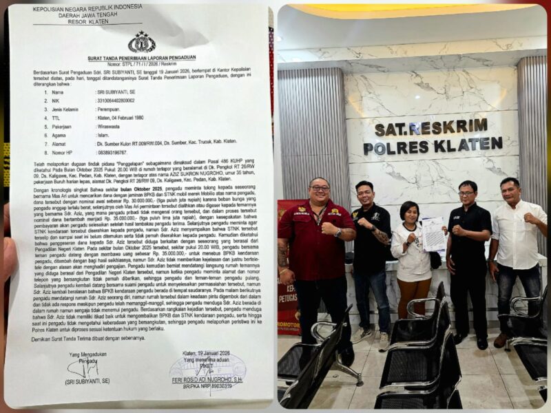 Kehadiran kami diterima dengan baik di Piket Reskrim Polres Klaten dan setelah tim HUKUM menyerahkan berkas aduan, berkas alat bukti awal, serta surat kuasa, dan setelah diperiksa sebentar Korban, aduan ditrima dengan baik dan diterbitkan tanda terima aduan oleh Polres Klaten dengan Nomor: STPL/71/I/2026/ResKrim ditandatangani Piket Reskrim Bripka Feri Rosid Adi Nugroho SH, NRP. 89030319.
