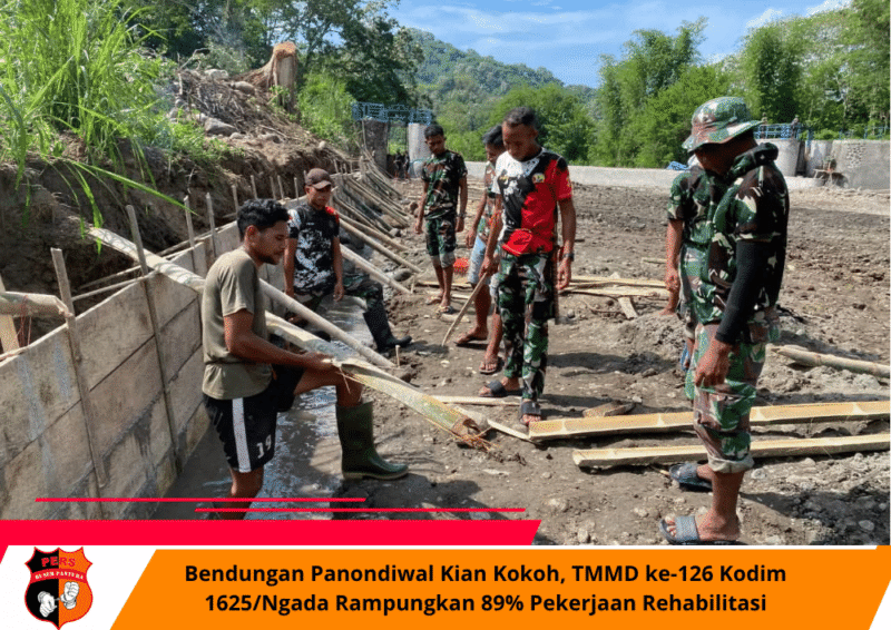 Buserpantura.id | Ngada, 3 November 2025 – Program TNI Manunggal Membangun Desa (TMMD) ke-126 yang dilaksanakan oleh Kodim 1625/Ngada terus menunjukkan perkembangan signifikan. Hingga awal November ini, kegiatan pengecoran sayap Bendungan Panondiwal yang berlokasi di Desa Benteng Tawa, Kecamatan Riung Barat, Kabupaten Ngada, telah mencapai progres pekerjaan sebesar 89 persen.