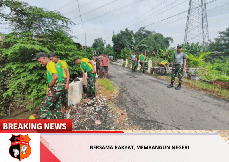 Melalui semangat gotong royong, prajurit Yonif 413/Bremoro bersama masyarakat dan Polri bahu-membahu melaksanakan pembersihan saluran air di salah satu jembatan Desa Plumbon, dengan adanya kegiatan ini TNI selalu hadir di tengah rakyat sebagai solusi dan penggerak kemajuan wilayah.