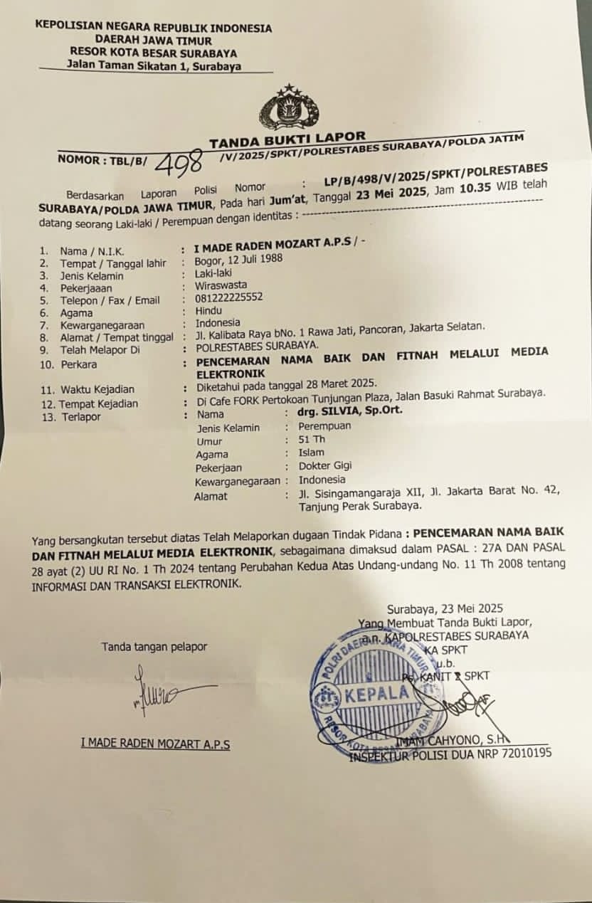 Hingga pada tanggal 23 Mei 2025 Mozart didampingi Penasihat Hukumnya, yakni Eddy Waluyo, S.H., melaporkan kejadian tersebut ke SPKT Polrestabes Surabaya, dan sedang didalami serta dilakukan penyelidikan oleh pihak penyidik.