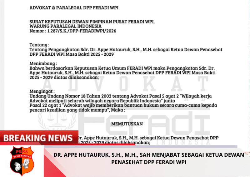 “Selasa lalu 17 Februari 2026 saya berkomunikasi dg Dr. Appe Hutauruk, S.H., M.H. berkaitan kesediaan beliau menjabat sebagai Ketua Dewan Penasehat Dewan Pimpinan Pusat FERADI WPI, dan Puji Tuhan beliau bersedia”. Dan telah terbit S.K. Penagangkatan Dr. Appe Hutauruk, S.H., M.H. sebagai Ketua Dewan Penasehat DPP FERADI WPI, S.K. terbit tanggal 18 Februari 2026. Sehingga Semenjak 18 Februari 2026 beliau secara resmi dan sah telah menjadi bagian pengurus DPP FERADI WPI.” Ujar Adv. Donny Ketum FERADI WPI.