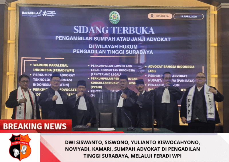 Buserpantura.id| SURABAYA — Organisasi advokat dan paralegal FERADI WPI menyelenggarakan pengambilan sumpah/janji advokat pada Jumat, 17 April 2026 di Aula Pengadilan Tinggi Jawa Timur, Kota Surabaya. Prosesi tersebut menjadi tahapan resmi bagi calon advokat sebelum menjalankan praktik profesi hukum sebagaimana diatur dalam Undang-Undang Nomor 18 Tahun 2003 tentang Advokat.