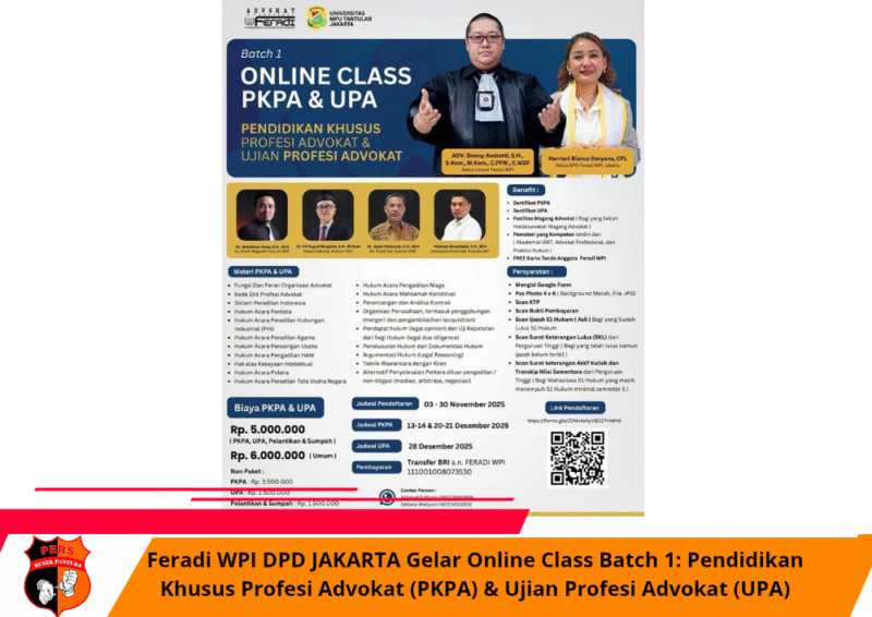 Dalam upaya memperkuat kapasitas hukum dan profesionalisme calon advokat, FERADI WPI bekerja sama dengan Universitas Mpu Tantular Jakarta membuka pendaftaran Batch 1 Online Class PKPA & UPA. Kegiatan ini merupakan Pendidikan Khusus Profesi Advokat dan Ujian Profesi Advokat yang akan digelar secara daring pada Desember 2025.