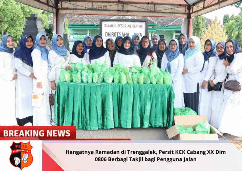 Buserpantura.id | Trenggalek – Semangat kebersamaan dan kepedulian di bulan suci Ramadan 1447 Hijriah dimaknai dengan aksi nyata oleh Persit Kartika Chandra Kirana (KCK) Cabang XX Dim 0806 Koorcab Rem 081 PD V/Brawijaya dengan membagikan ratusan paket takjil kepada masyarakat dan para pengguna jalan yang melintas di depan Markas Kodim 0806/Trenggalek, Rabu (11/3/2026). Kegiatan sosial tersebut menjadi salah satu bentuk kepedulian kepada sesama, khususnya bagi warga yang masih berada di perjalanan menjelang waktu berbuka puasa.