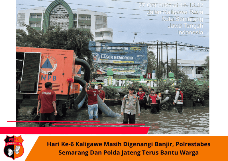 Buserpantura.id | SEMARANG,Senin 27 Oktober 2025 – Memasuki hari keenam pascabanjir yang melanda kawasan Kaligawe, Genuk, Kota Semarang, genangan air masih belum sepenuhnya surut. Meski demikian, aparat kepolisian dari Polrestabes Semarang dan Polda Jawa Tengah tetap siaga membantu warga terdampak, terutama di sepanjang Jalan Kaligawe yang menjadi jalur penting karena ramainya masyarakat dan karyawan yang beraktivitas menuju Rumah Sakit Sultan Agung yang terletak di kawasan tersebut.