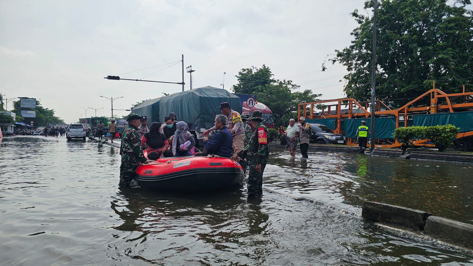 Selain melakukan rekayasa lalu lintas, personel Satlantas Polrestabes Semarang juga melakukan evakuasi warga yang hendak menuju RS Sultan Agung menggunakan perahu karet. Langkah ini diambil untuk memastikan masyarakat tetap dapat memperoleh pelayanan kesehatan dengan aman di tengah genangan air yang belum surut.