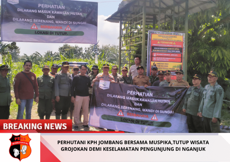 Buserpantura.id| JOMBANG, (17/04/2026) — Perhutani Kesatuan Pemangkuan Hutan (KPH) Jombang bersama Muspika Kecamatan Lengkong, Kabupaten Nganjuk, menutup Wisata Kali Grojokan Duwur, guna menghindari timbul korban karena lokasi tebing berbahaya, curah hujan tinggi berpotensi air bah (luapan air deras yang datang tiba-tiba dari atas), longsor, pohon tumbang, dan licin saat hujan.
