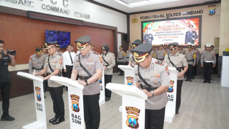 Buserpantura.id | Jombang – Polres Jombang menggelar upacara serah terima jabatan (sertijab) Wakapolres, Kabagops, Kasat Lantas serta pengukuhan jabatan Kasiwas, Kamis (15/1/2026) pagi. Kegiatan berlangsung di Ruang Jombang Command Center Mapolres Jombang.