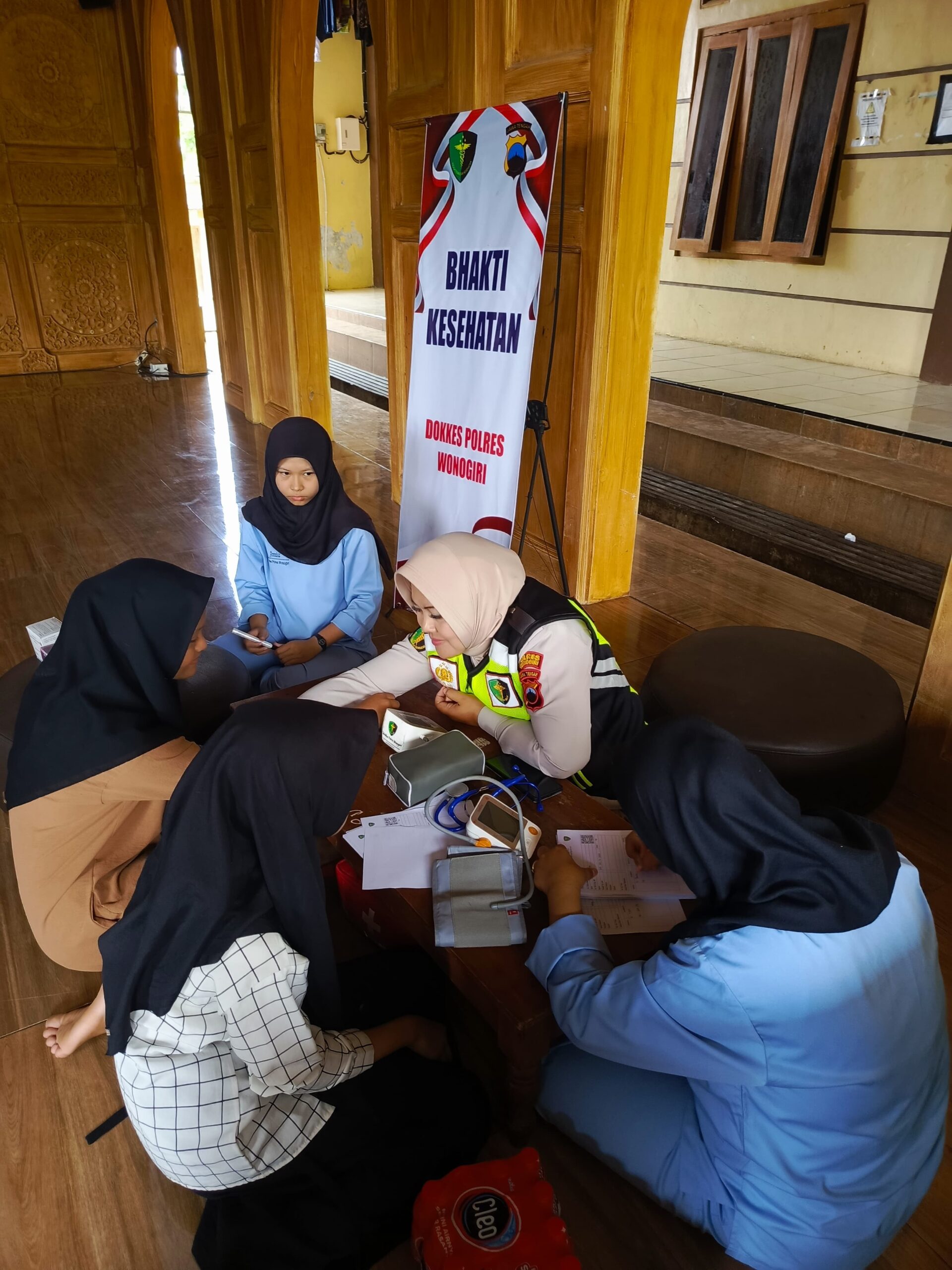 Kasidokkes Polres Wonogiri, Penda Sulistyowati, S.Kep., Ns., menyampaikan bahwa kegiatan bakti kesehatan tersebut meliputi pemeriksaan kesehatan umum dan pemberian vitamin untuk meningkatkan imunitas para santri.