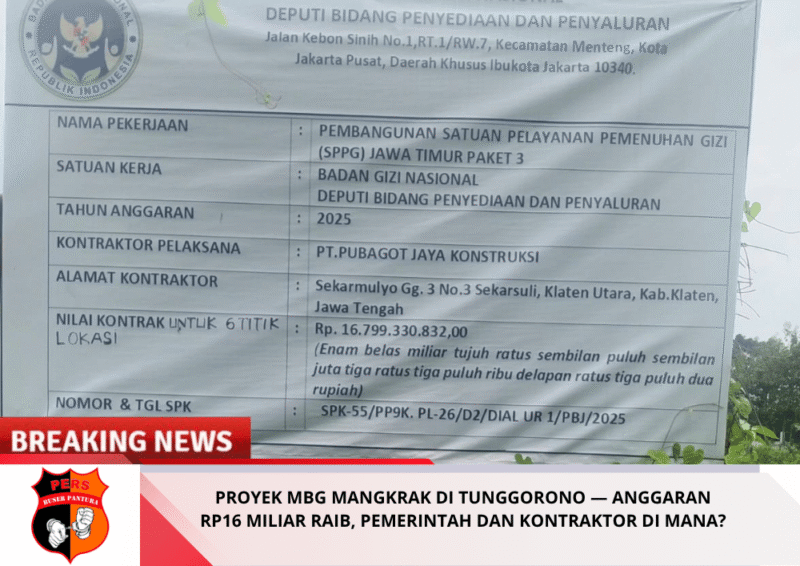 Buserpantura.id| Jombang,27 April 2026 — Proyek pembangunan MBG di Desa Tunggorono, Kecamatan Jombang, Kabupaten Jombang yang semestinya menjadi bukti nyata kehadiran negara dalam pembangunan, kini justru berubah menjadi monumen kegagalan. Proyek yang dikerjakan oleh PT Pubagot Jaya Konstruksi tersebut tampak terbengkalai tanpa arah, tanpa progres, dan tanpa kejelasan. Di tengah kondisi ini, publik dikejutkan dengan besarnya nilai anggaran yang disebut-sebut mencapai kurang lebih Rp16 miliar. Pertanyaan pun mencuat dengan tajam: ke mana sebenarnya uang sebesar itu mengalir?